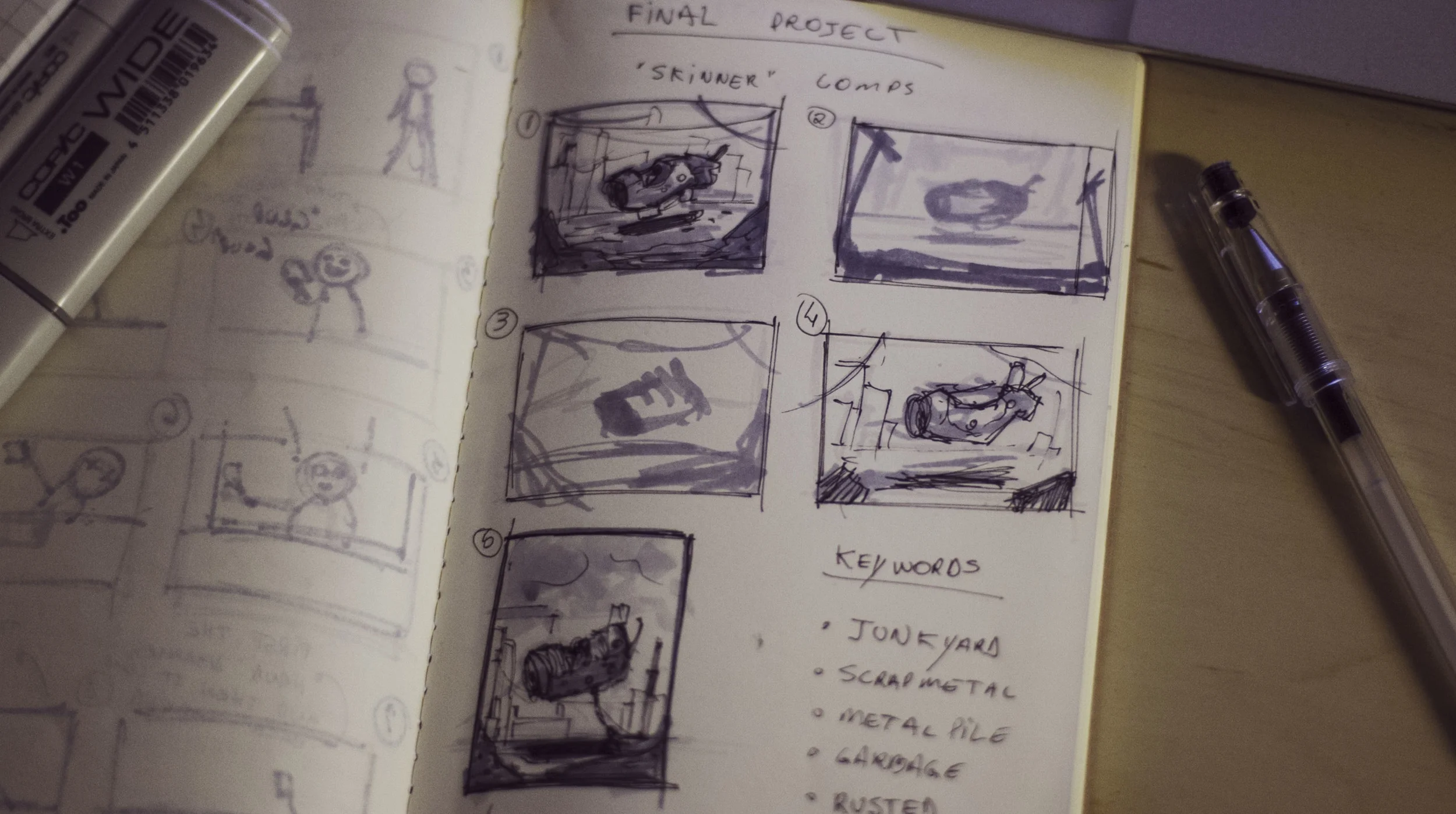 During the days for pre production, I began to think about the composition. For me, the best way to develop different ideas is using quick sketches with pen and paper.