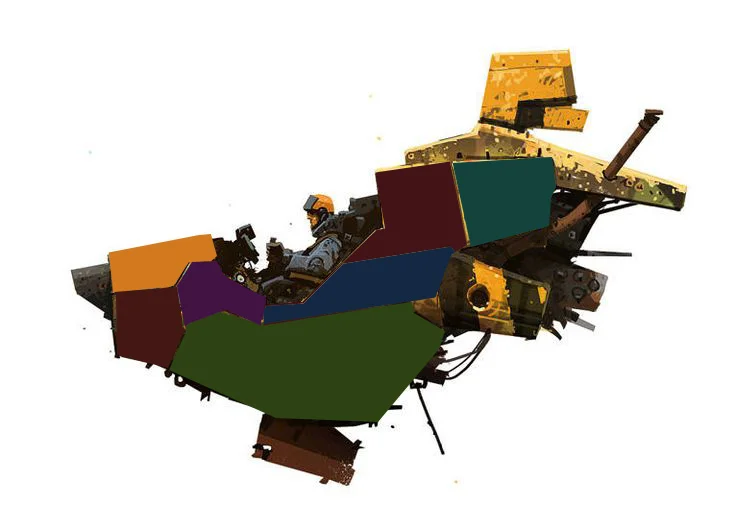 The engine was basically the same process, using tileable metal textures with different color hues and saturation to create interesting color variation. After finishing the color pass, I created more passes. Dirt, decals, leaking and scratches and holes. Those passes were extremely important to convey the realistic feel for a junky hovercraft.
