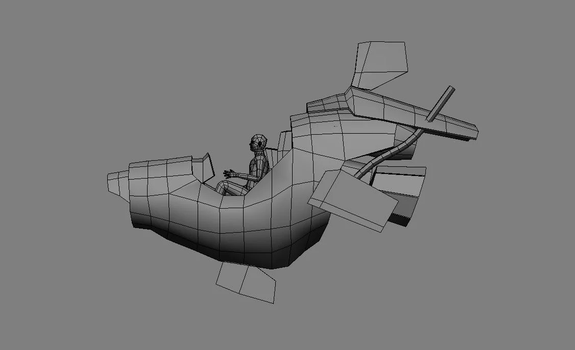 Using this idea I began to block the scene inside Maya, thinking about elements on the scene to help the composition, and I also started to develop a pose for the pilot.
