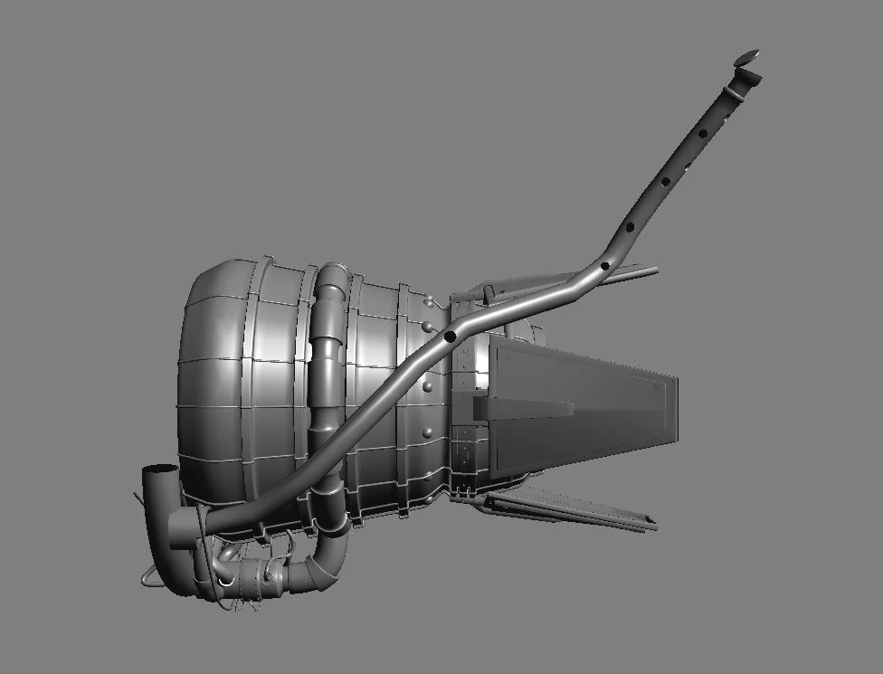 After this, I began separating the panels. It was a tricky part because the concept doesn’t give the exact seams on the hovercraft, so I decided to make my own choice for the design. After dealing with the main part of the ship, I started detailing the turbine. This part was really fun because I had freedom to create my own design. I asked a classmate who knows a lot about jet engines to give me a lesson about it. After some time, I generally understood how turbines work, and then I used my references to finish the model.