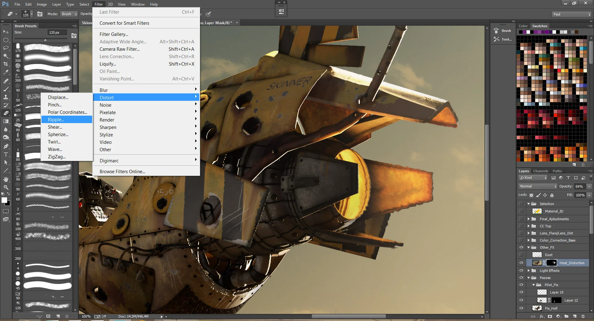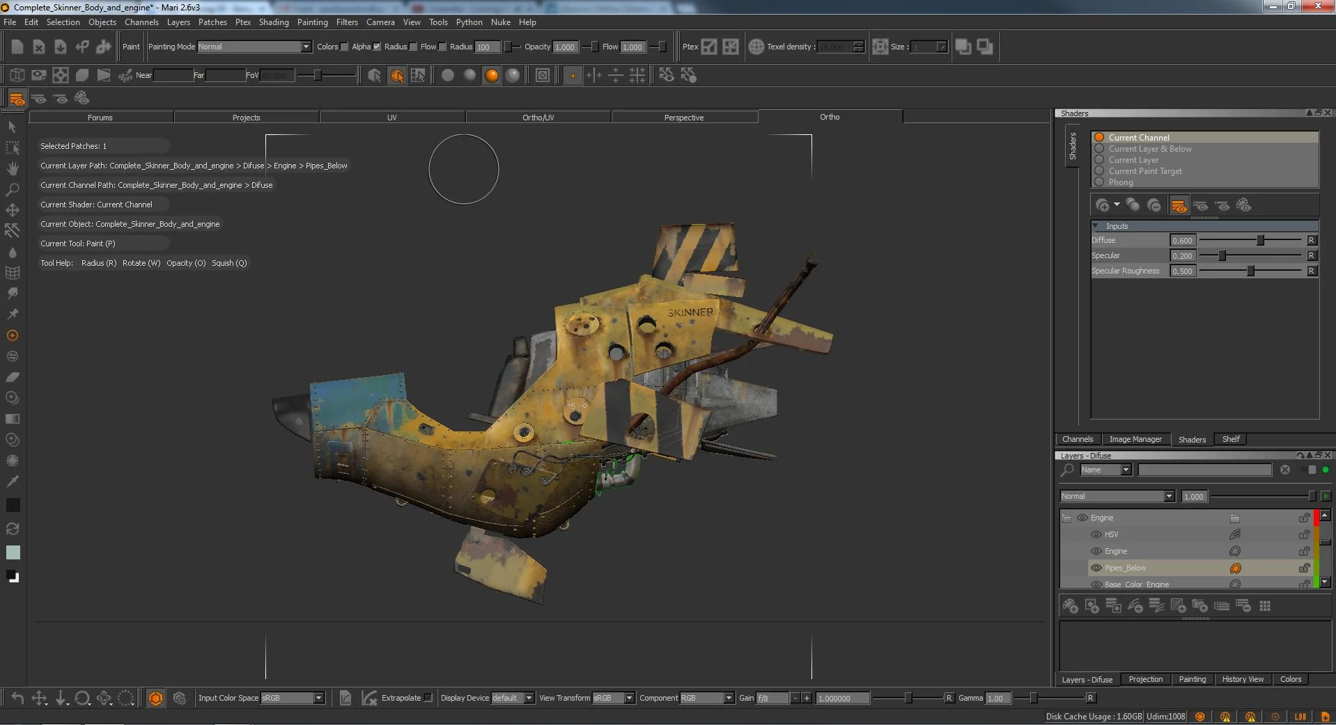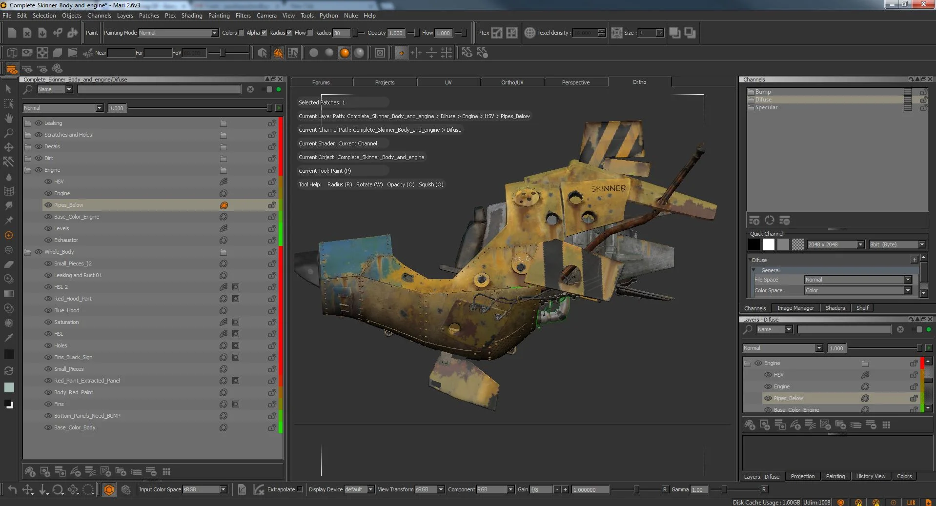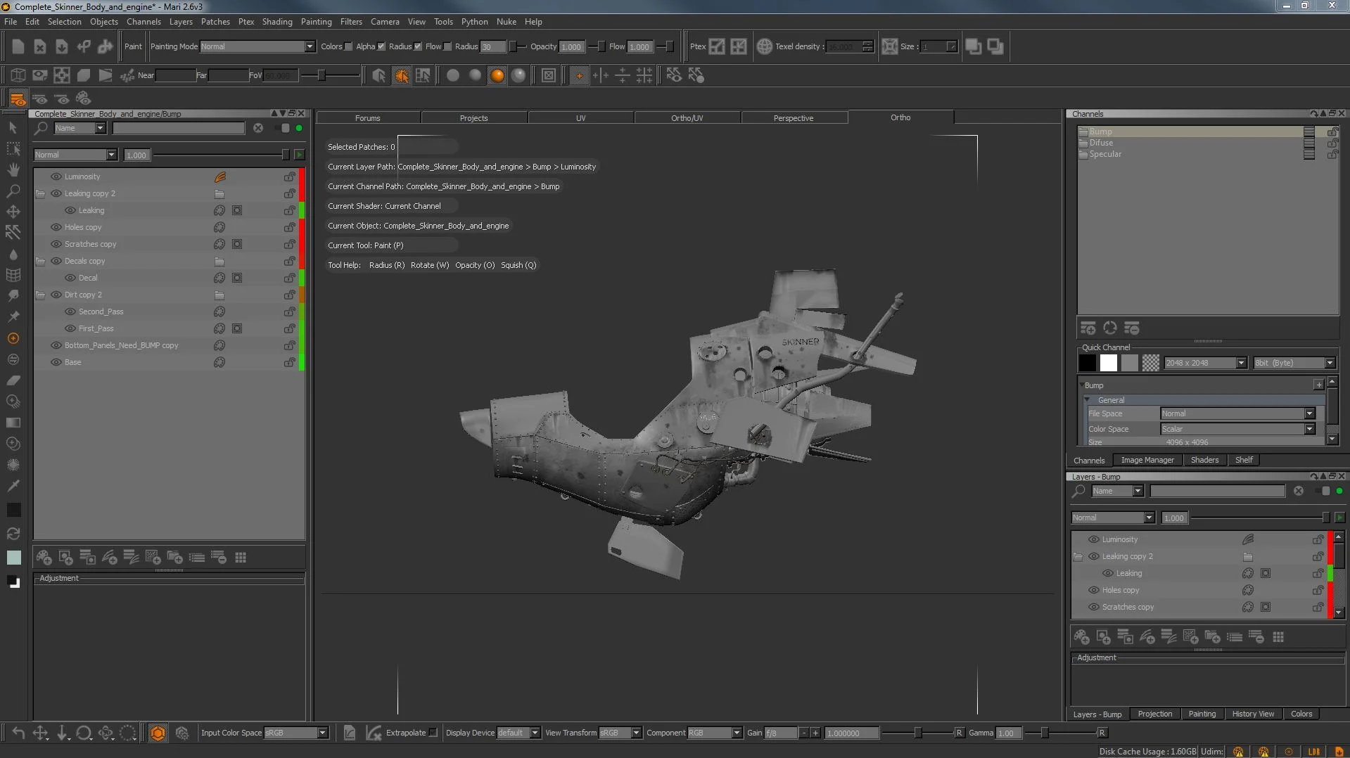 Because I had to separate the UV Tiles, I could easily select each patch and hide or unhide whenever I wanted. This is a great resource inside Mari and sped up my texturing workflow a lot. Using folders and layers, I put the hull and the turbine/engine into separated folders, this way I was able to easily adjust my textures later. Keeping the project and layers organized helps a lot. Never forget to name layers and objects as much as possible, otherwise you will waste a lot of time later on.