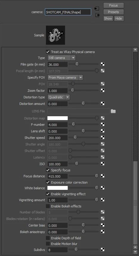 Using Vray as my render engine, I set up a physical camera to achieve more realistic results.