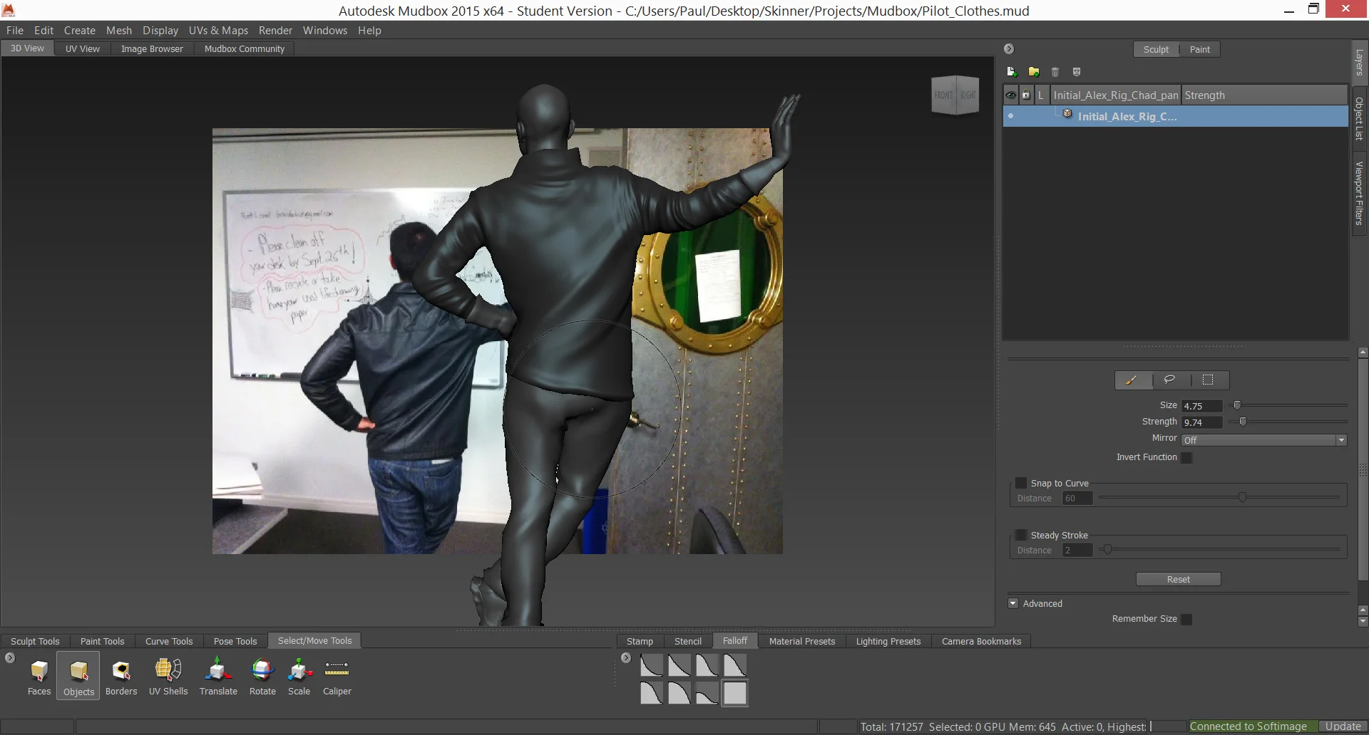 After posing the character properly, I started to think about clothing. Thinking about my storyline, I envisioned him using a leather jacket, gloves and a helmet. I brought the model to Mudbox and I used my jacket as a reference (matching the pose) to sculpt the folds.